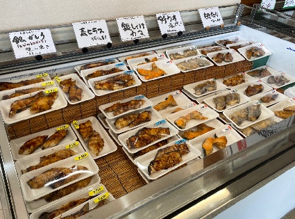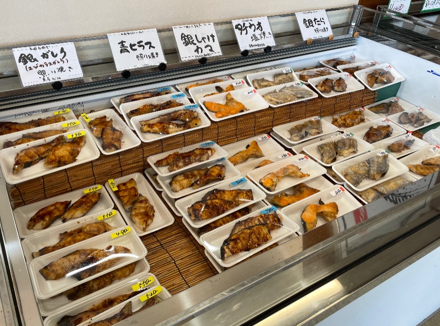 仕入れた魚は自店舗で丁寧に加工。荒浜の風と太陽の恵みを浴びた干物や、ふっくらと香ばしい自家製の焼き魚は、地元でも愛される逸品。お土産にも大好評です。